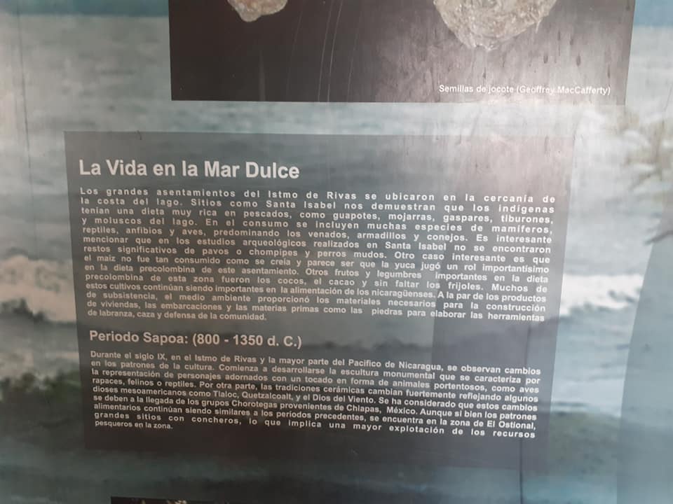 The large settlements of the Isthmus of Rivas were located in the vicinity of the lake coast. Sites like Santa Isabel show us that the natives had a diet very rich in fish, such as guapotes, mojarras, gaspares, sharks and mollusks from the lake. Consumption includes many species of mammals, reptiles, amphibians and birds, predominantly deer, armadillos and rabbits. It is interesting to mention that in the archaeological studies carried out in Santa Isabel, no significant remains of turkeys or chompipes and wild dogs were found. Another interesting case is that corn was not consumed as it was believed and it seems that cassava played an important role in the pre-Columbian diet of this settlement. Other important fruits and vegetables in the diet continue to be important in the diet of Nicaraguans. Along with housing products, boats and raw materials such as stones to develop tools for farming, hunting and defense of the community.