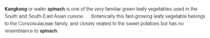 According to a source online: Kangkong or water spinach is one of the very familiar green leafy vegetables used in the South and South-East Asian cuisine. Botanically this fast-growing leafy vegetable belongs to the Convolvulaceae family, and closely related to the sweet potatoes but has no resemblance to spinach.