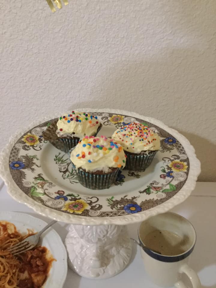 Check out the yummy cupcakes I baked. I put premade buttercream icing that came in a can on top of chocolate.