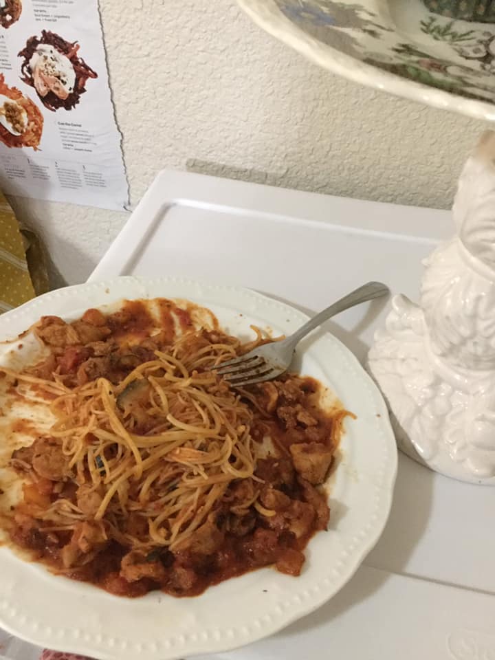 Check out this awesome angel hair pasta spaghetti I made. It’s really easy to make. I just boil angel hair pasta and use pasta sauce from a jar.